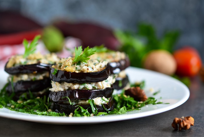 Mελιτζάνες με φακές, καρύδια και κρέμα από φυτικό γιαούρτι και ταχίνι