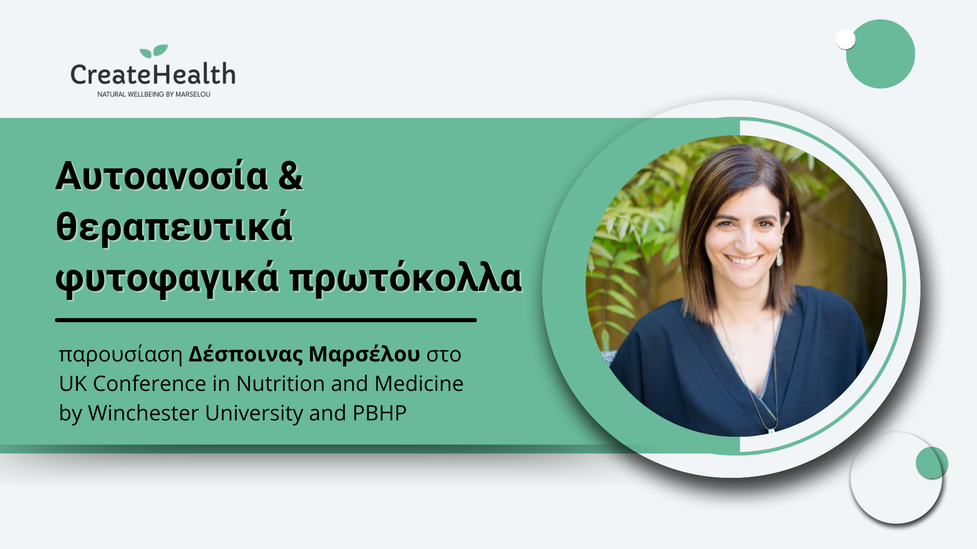 Η Δέσποινα Μαρσέλου, Κλινική Διαιτολόγος-Διατροφολόγος με εξειδίκευση στα αυτοάνοσα και τη φλεγμονή και μετεκπαίδευση στη φυτοφαγία, καθώς και μια εκ των ιδρυτριών του Create Health, συμμετείχε πριν κάποια χρόνια στο UK Conference in Nutrition and Medicine που διοργάνωσαν το Winchester University και οι UK Plant-based Health Professionals (PBHP, 2019). Η παρουσίασή της είχε θέμα: «Αυτοανοσία και θεραπευτικά φυτοφαγικά πρωτόκολλα» και περιλάμβανε ένα case study με πρωτόκολλο για εξαιρετικά σπάνια μορφή ψωρίασης.